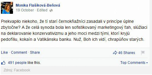 Flašíková Beňová zverejnila 19. októbra na sociálnej sieti tento výrok: „Prekvapilo niekoho, že tí starí černokňažníci zasadali v princípe úplne zbytočne? A že celá synoda bola len sofistikovaný marketingový ťah slúžiaci na deklarovanie konzervativizmu a jeho moci medzi tými, ktorí kryjú pedofíliu, kokaín a Vatikánsku banku. Nuž, Boh ich vidí, chrapúňov starých“.