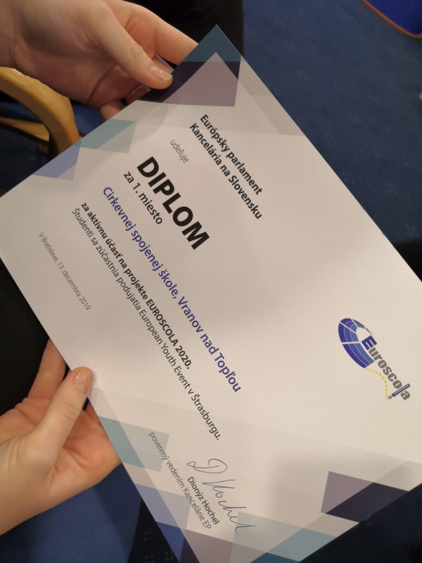 Tak toto sme si v piatok 13. decembra t.r. zakričali pri vyhlasovaní výsledkov celoslovenskej súťaže EUROSCOLA 2020 v Bratislave na Palisádach.