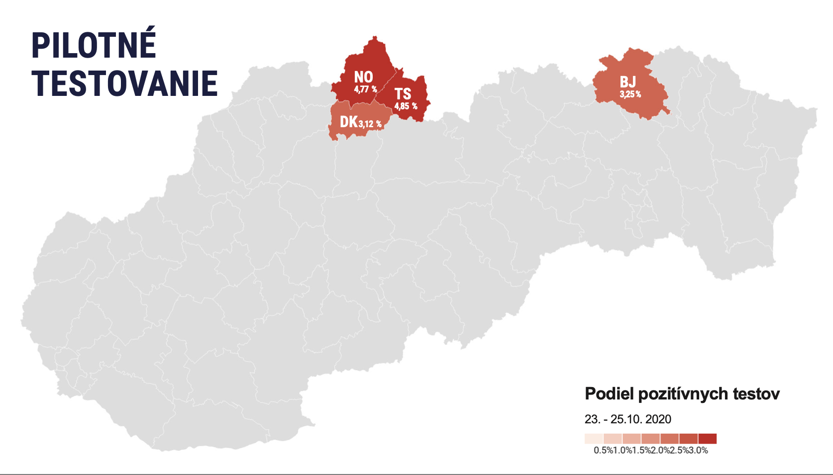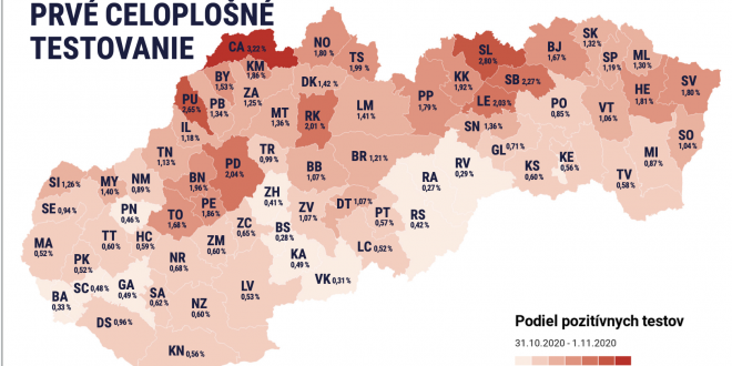 Najvyšší počet pozitívnych prípadov identifikovali v okrese Čadca(3,22) a Stará Ľubovňa (2,9). Pričom najmenší pomer pozitívnych testov bol v Revúcej a Rožňave, kde pozitivita prestavuje necelých tri desatiny percenta.