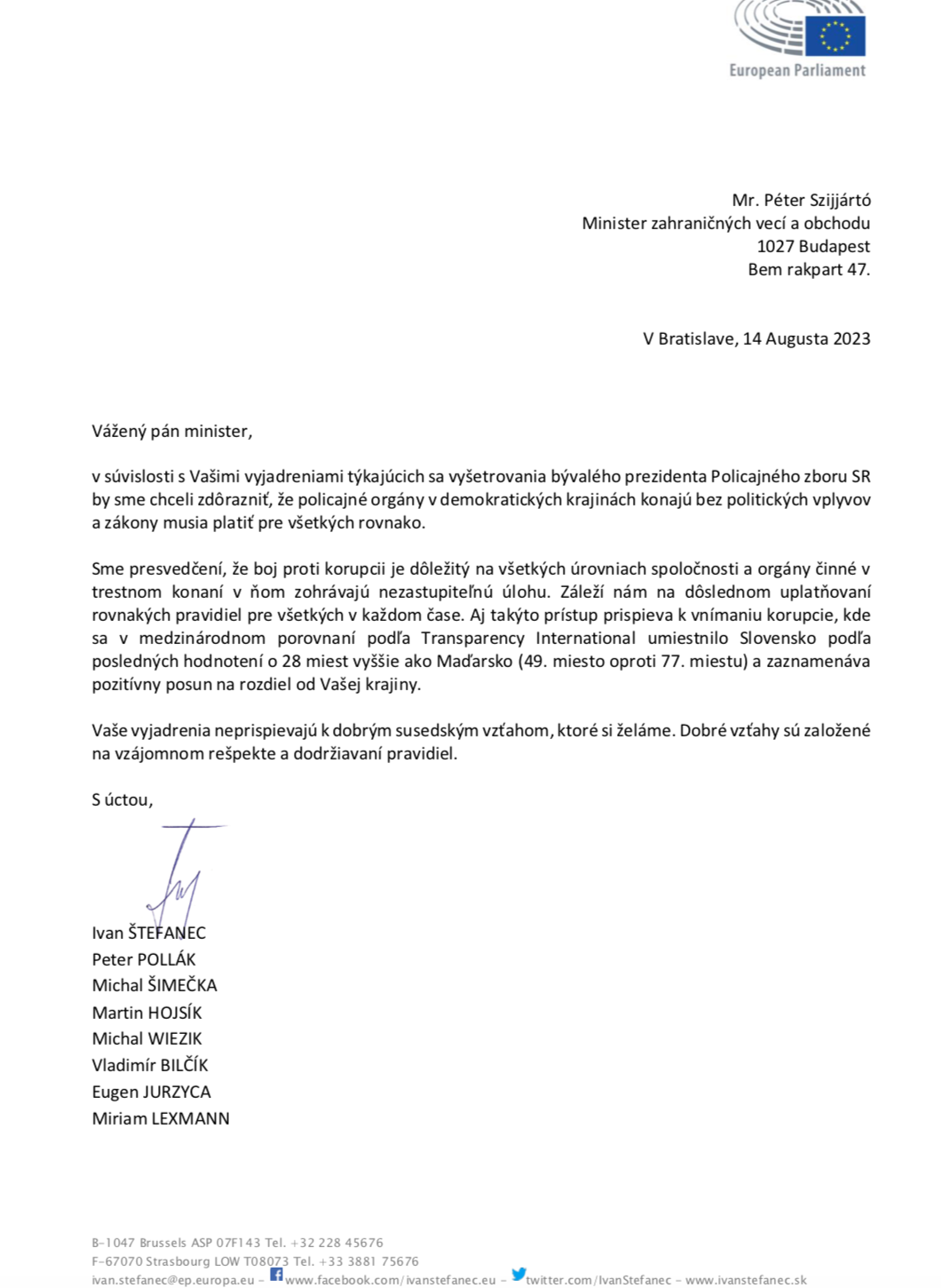 Slovenský europoslanec a vedúci slovenskej delegácie pri Európskej ľudovej strane Ivan Štefanec (KDH) zaslal maďarskému ministrovi zahraničných vecí Pétarovi Szijjártóovi oficiálny list, v súvislosti s jeho nedávnym komentovaním postupu slovenských policajných orgánov.
