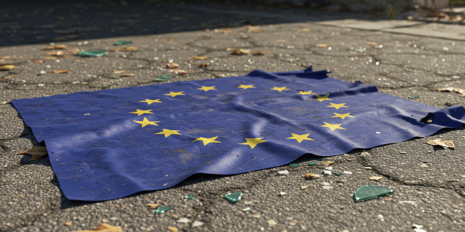 Vlajka EÚ v prachu, pošliapaná, ILU. ZDROJ: aihub